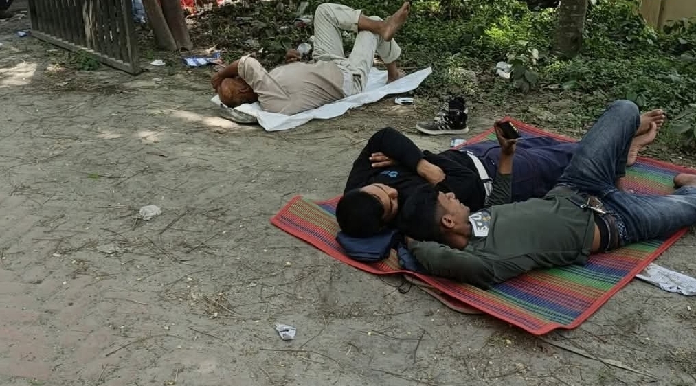 দীর্ঘ লাইনে দাঁড়িয়ে তপ্ত রোদে অতিষ্ঠ হয়ে অনেকেই পাশের গ্রামীণ ব্যাংকের সাহাপুর শাখার সামনে গাছের নিচে মাদুর বিছিয়ে বিশ্রাম নিচ্ছেন। কেউ কেউ আবার শুয়ে মোবাইল ব্যবহার করতেও দেখা গেছে।